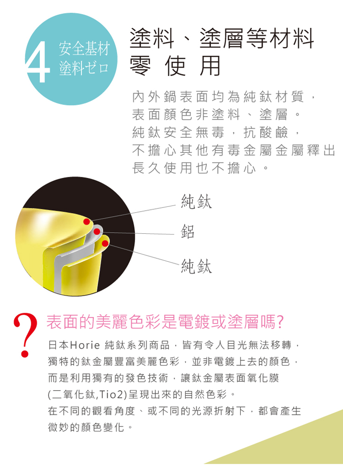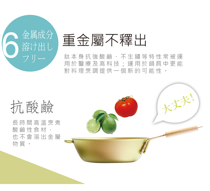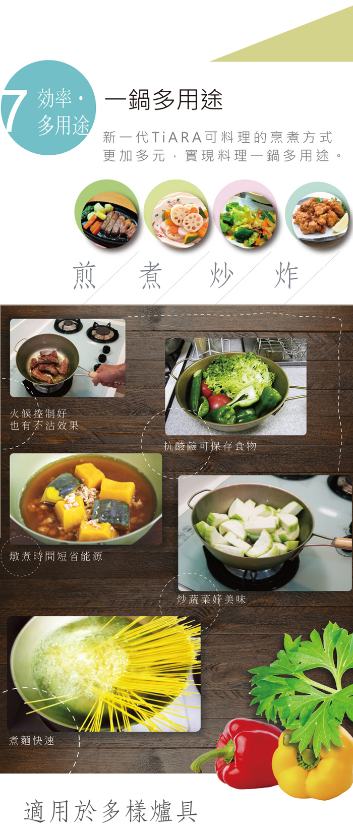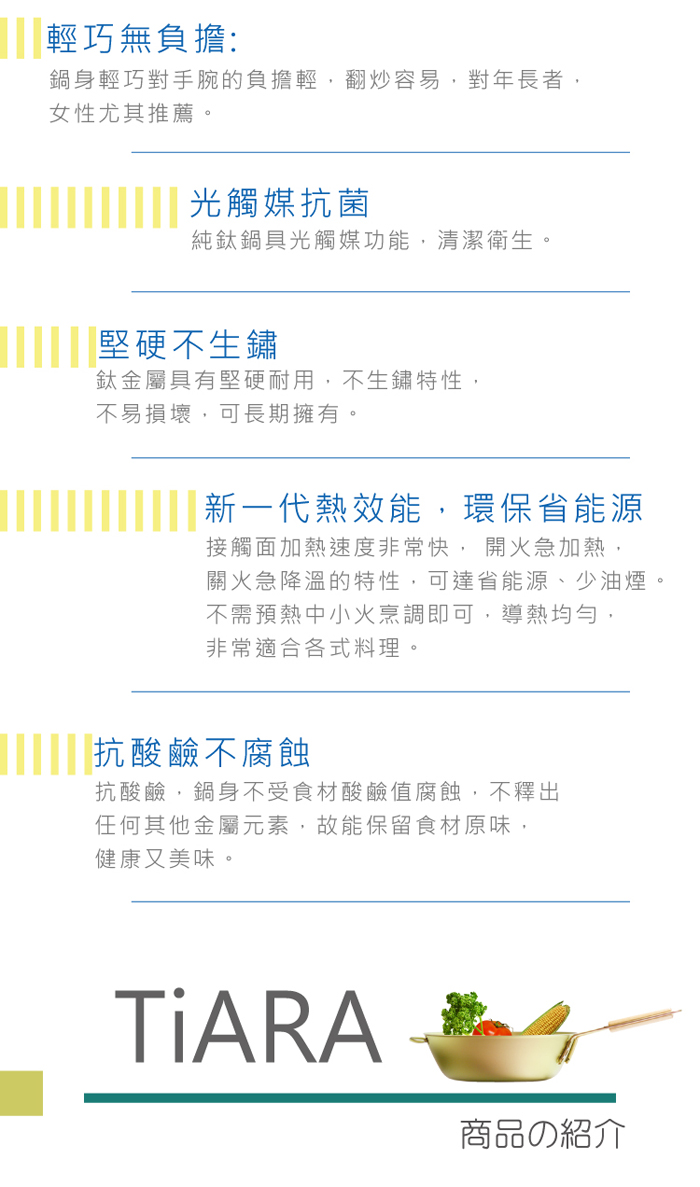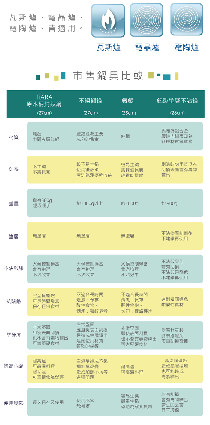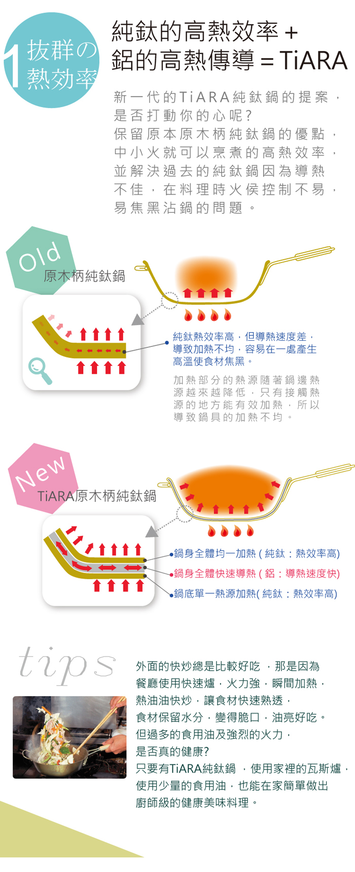 純鈦的高熱效率+鋁的高熱傳導=TiARA 輕巧無負擔、光觸媒抗菌、堅硬不生鏽 環保省能源、抗酸鹼不腐蝕 |