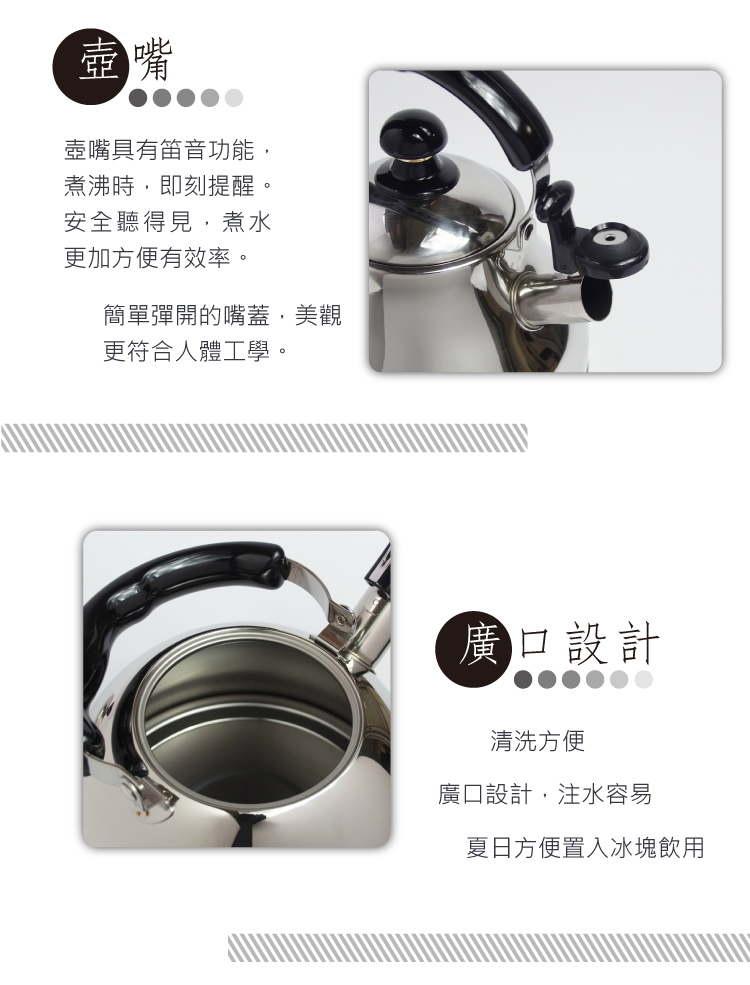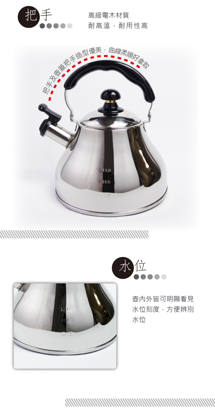 壺底使用日本高級18-0導磁不鏽鋼, 厚度僅0.5mm導熱迅速均勻, 煮水效率更快更節能。 |