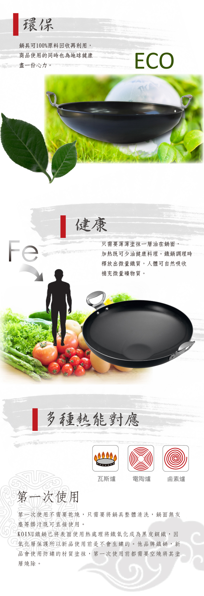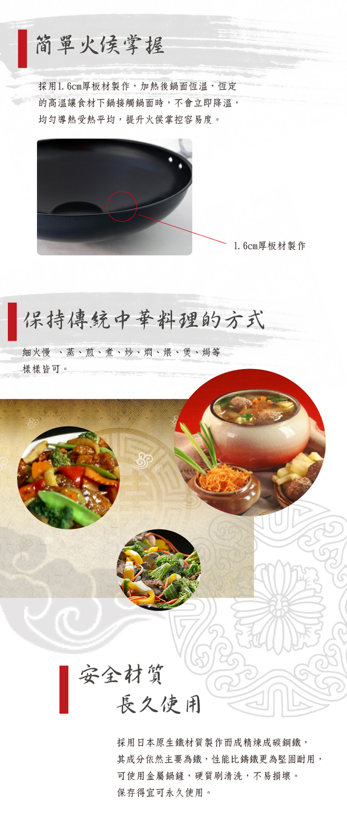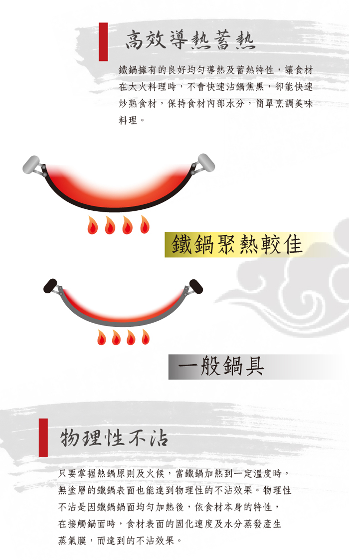 高效導熱蓄熱 , 安全材質 , 簡單火侯掌握 保持傳統中華料理的方式 ~ 燉、蒸、煎、煮、炒、燜、煨、煲、焗等樣樣皆可。 長久使用 ~ 使用100%的原生鐵材質製作而成。 |